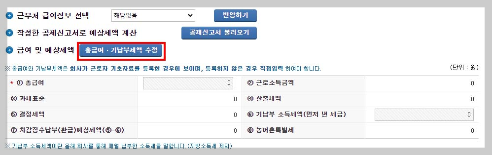 총 급여, 기납부 세액 금액 수정이 필요합니다.