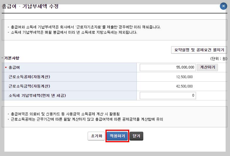 파란색 버튼을 클릭하여 직전 해의 총 급여액과 기납부세액(기존 납부한 세액)을 작성해 주세요