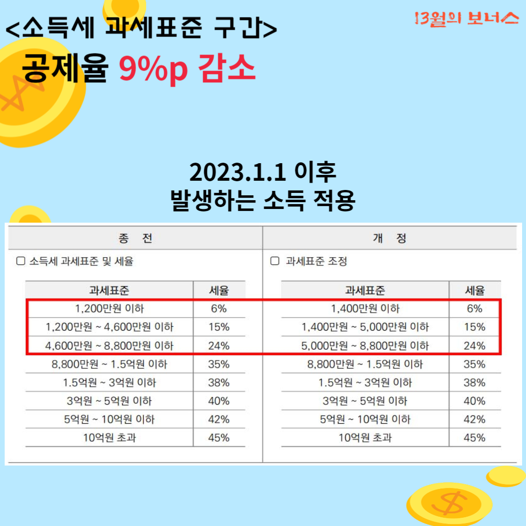 요즘 물가 상승이 무섭습니다. 그래서 서민, 증산층 세부담을 완화 위해 소득세 과세표준 구간이 변경되었습니다.